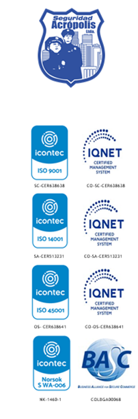 SEGURIDAD ACRÓPOLIS LTDA, cuenta con la certificación del Sistema de Gestión integral NTC ISO 9001:2015, NTC ISO 14001:2015, NTC ISO 45001:2018, Norsok S WA-006, BASC V5: 2017; promoviendo la mejora continua en los procesos de la organización; en cumplimiento a lo establecido en el decreto 1072 de 2015, Resolución 0312 de 2019 y la normatividad legal vigente, se ha estructurado integrar dentro del SGI, el Sistema de Seguridad y Salud en el Trabajo (SG-SST), que tiene como propósito la acción conjunta entre la empresa y los trabajadores, en la aplicación de las medidas de Seguridad y Salud en el Trabajo (SST), a través del mejoramiento continuo de las condiciones y el medio ambiente laboral y el control eficaz de los peligros y riesgos en el lugar de trabajo, evitando lesiones y deterioro en la salud de los trabajadores de la organización.
